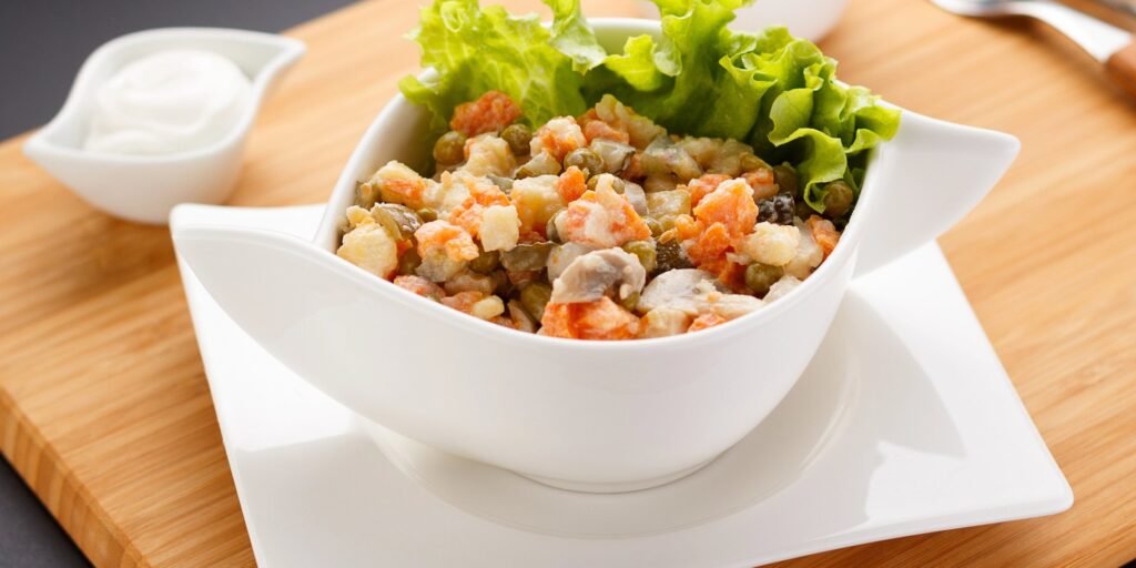 Вегетаріанський олів’є рецепт готується без м’яса, але при цьому залишається смачним. Ковбасу замінюють на додаткову порцію овочів або рослинні альтернативи. Таким чином, салат підходить для всіх, хто не вживає м’ясо.